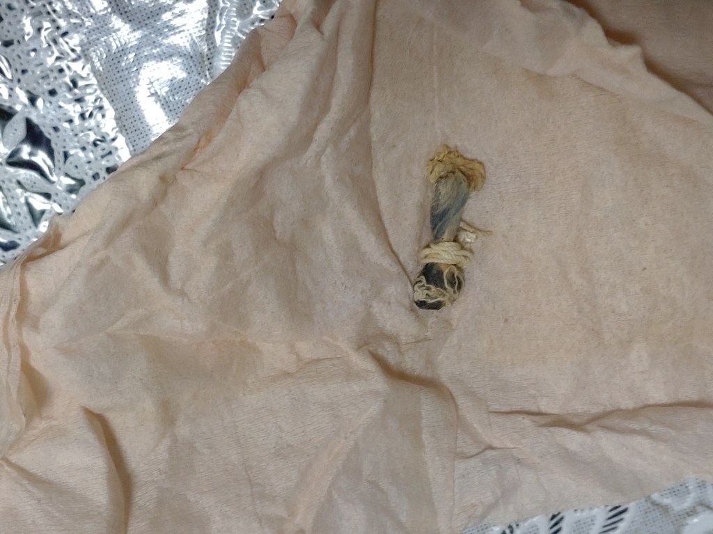 これまでも九州大学油症治療班では、2009年の「福岡医学雑誌」に報告していますが、なぜかその後「へその緒」について、蔑ろにされてきています。こちらは長崎県在住のカネミ油症患者が保管する「へその緒」です。一度九州大学の検査後、返還されたもので、微量しか残されていません。1973年に誕生した男児と繋いでいた「へその緒」ですが、生後4カ月で亡くなりました。女性は今も訴えます。「息子がカネミ油症で口蓋口唇裂などで亡くなったことを証明してほしい」と。
