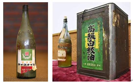 今もこの「へその緒」は木箱に収められ、大事に神棚に載せられています。こちらがカネミ油症事件の原因となった「カネミライスオイル」の1升瓶と一斗缶です。