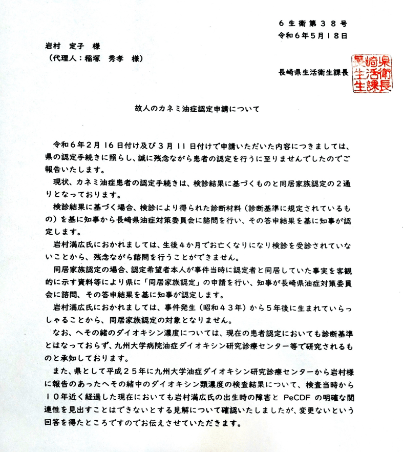 「原澤先生、これは昨日の油症対策会議で紹介された、長崎県奈留島の岩村さんのお子さんのへその緒です。今月中に、京都にある島津テクノリサーチに持ち込み、検査してもらいます。その結果をお伝えしますので、検討してください」と伝えましたが、確たる返事はありませんでした。