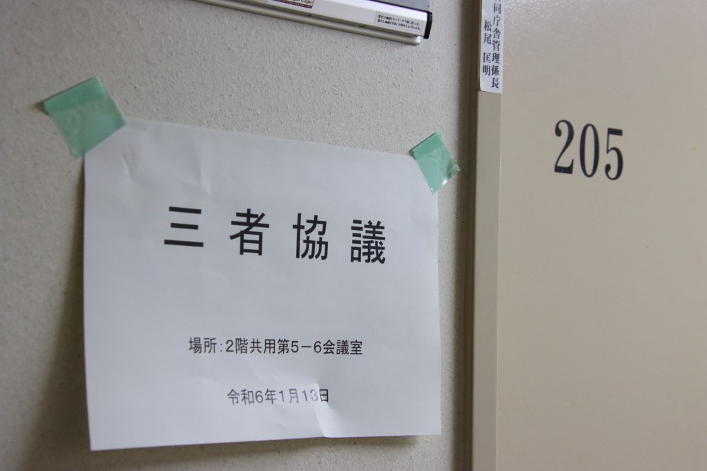 年末の申請には、会社名と参加者名で、記者クラブに所属するメディアは、それで十分だったのだろう。その日夕方、ようやく「明日の三者協議の参加はOK」との連絡が入った。当日はそれでも不安だったので、開始1時間前の8時30分には現場に到着。無事福岡県庁の庁舎内に入った。