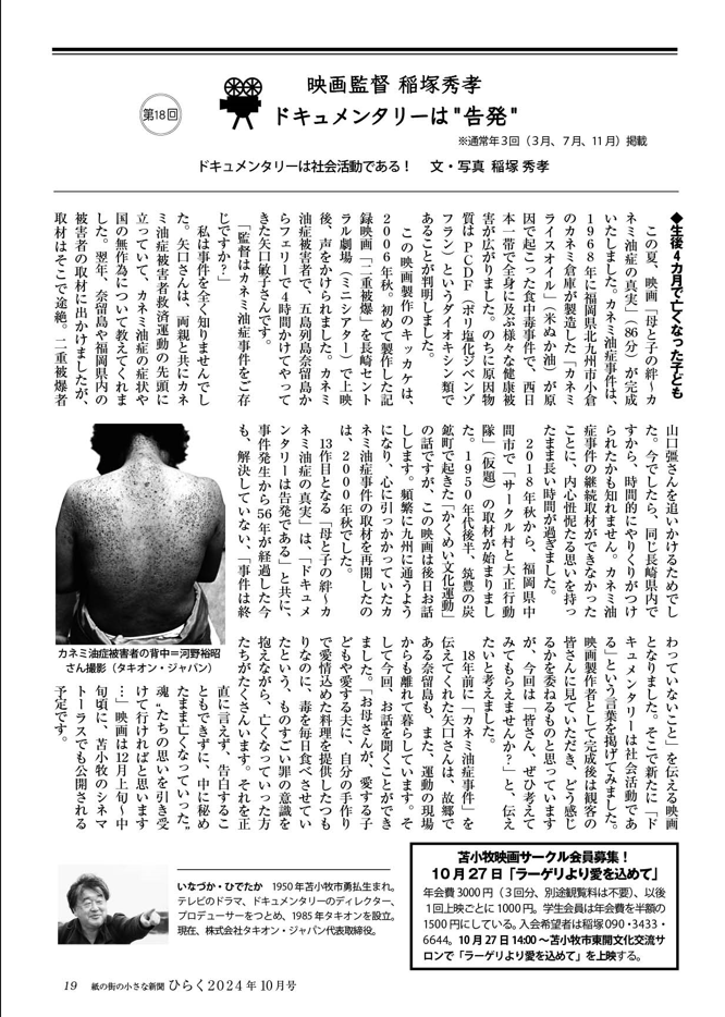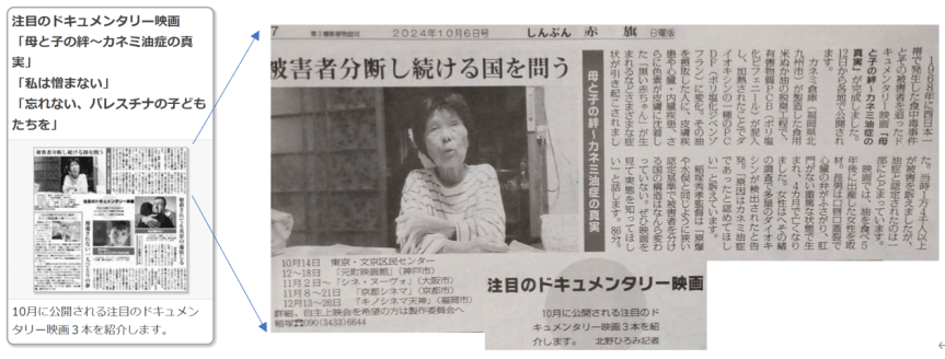 国内最大規模の食品公害について伝える記録映画「母と子の絆 カネミ油症の真実」が、10月から関西を皮切りに劇場で公開される。国や原因企業による救済が不十分だと訴え、子や孫への影響を心配し続ける親たち。そんな姿を前にした監督が、今も苦しむ人や研究者らの証言を一つひとつ集めた。